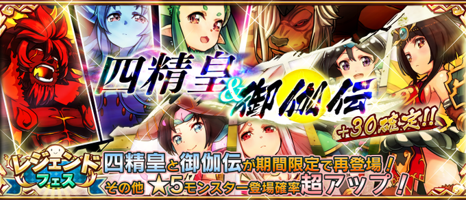 今回は御伽伝と四精皇が登場!さらに★5モンスターの登場確率アップ&全モンスター+30で登場!要チェックです( ✧Д✧) #アニモン