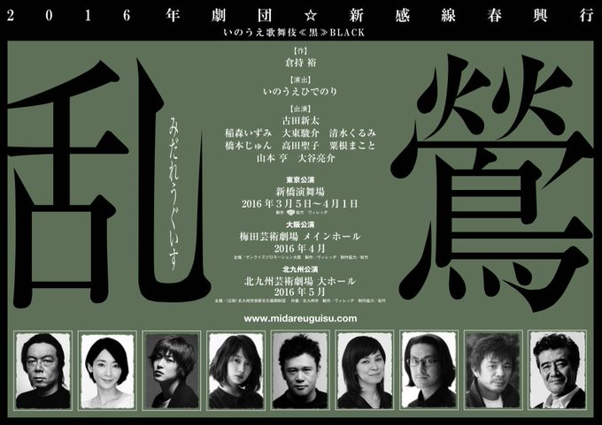 古田新太×稲森いずみ×大東駿介! 劇団☆新感線の新作舞台「乱鶯」が2016年3月 上演決定!今回は「いのうえ歌舞伎《黒》BLACK」なんですって!どんなのになるんだろう。
