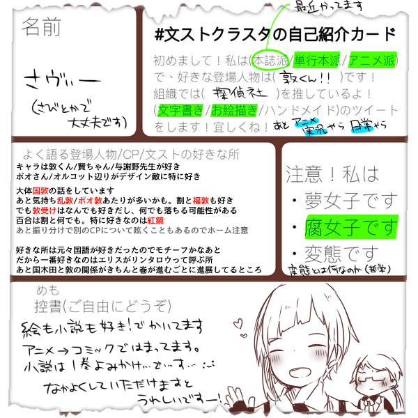 レナトスの原稿終わってないから行けるわけがないんだよなあ!!!!!!!!! 国敦筆頭に乱敦/福敦/花敦/ポオ敦あたりが特に好き。敦受け以外は基本触れません(百合除く) でも大体いつも国敦の話してる #文傑お留守番組で繋がりませんか