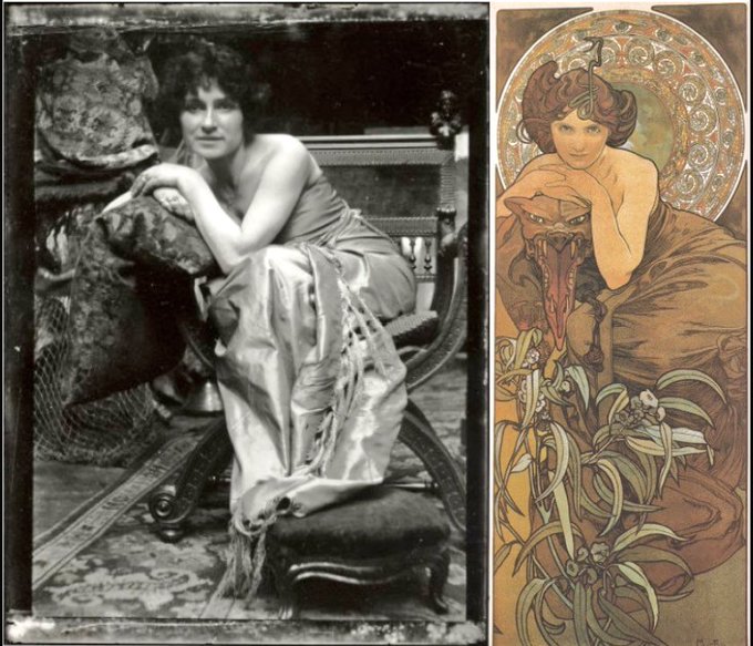 チェコ出身のグラフィックデザイナー,イラストレーター,画家アルフォンス・ミュシャ(1860-1939)は7月24日が誕生日。舞台女優サラ・ベルナールのポスターや宝飾品のデザイン(制作は主にルネ・ラリック)を手がけたアール・ヌーヴォーの旗手。サラではなさそうだがモデルと作品も。装飾的な曲線美に陶然…
