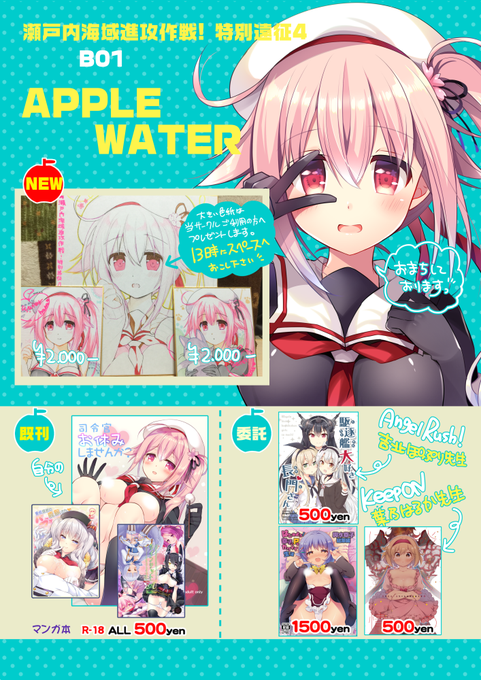【お品書き】5/21広島で開催の瀬戸内海域進攻作戦!特別遠征4に参加します。B01「Apple Water」新しいのは頒布用とプレゼント用の色紙が有〼。ぽぷり先生と葉乃先生の本も委託有〼。都合で13時頃撤収予定ですのでスケブは…当日聞いてみて下さい!よろしくです~。
