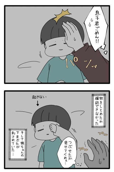 息子君も朝は目立ってなかったですが、療育から帰ってきた頃には吸われてた所が赤く腫れてました😰 2人とも目の付近なので慎重にお薬を塗りました。 大きさ的に以前しとめそびれたでかい蚊だと思うのでしとめられたと信じたいです。 #漫画が読めるハッシュタグ #子育て #育児 #育児漫画