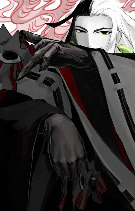 #フォロワーさんからイメージもらって自分を殺人鬼化する 黒いベスト・投げナイフ・イケメンクール美人・死体処理速そう・登場の度に背後で花が咲き乱れる・黒目に模様・黒革手袋