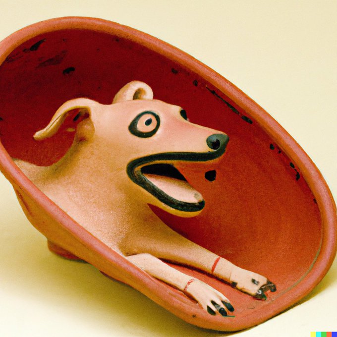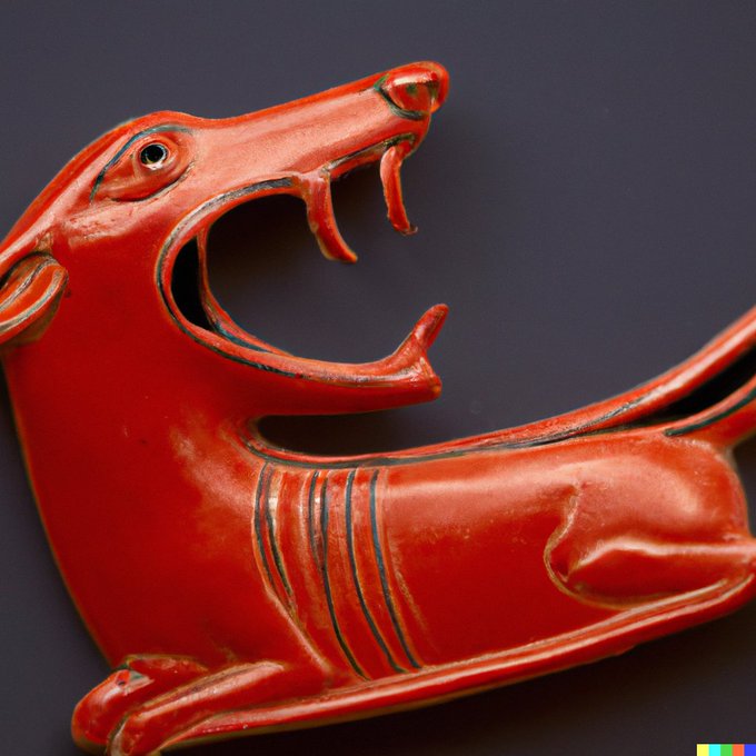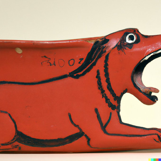 Creating an artifact that looks genuine didn't work with #Dalle2, but the prompt "red-figure pottery sherd depicting a yawning dachshund, Athens, circa 500 BC" still gave interesting results. I especially like the last one...