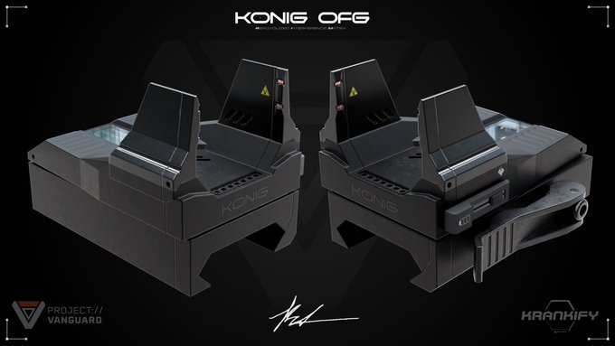 "The OFG, manufactured by KONIG Tactical, is a holographic gunsight which uses Aerosolized Interference Matrix technology to materialize a hologram out of thin air." Many thanks to @Krankify for such a magnificient piece !
