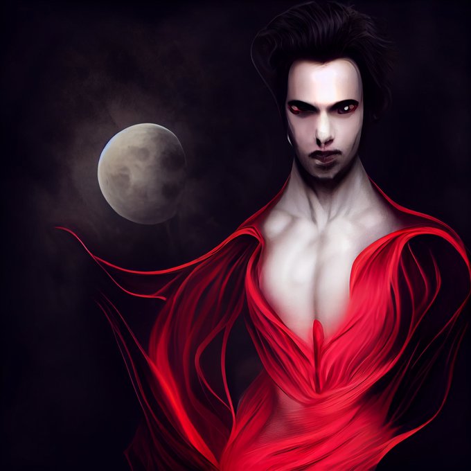 the prompt: male vampire, powerful, body shape, full body art, light from the moon, flowing dress, gothic background, glowing red