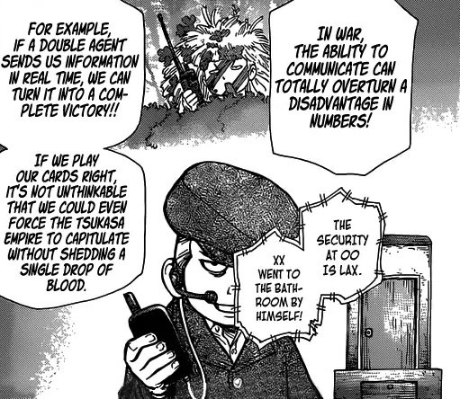 The spy part in the manga is a bit different: the undercover guy is Senkuu (same scars) and the other one is Magma (?) while in the anime they show Gen and Senkuu because anime staff ship them more than the all sengen fam together.