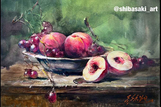 食べる前に、美味しそうな桃を描いたよ。おじいちゃん先生の水彩画
