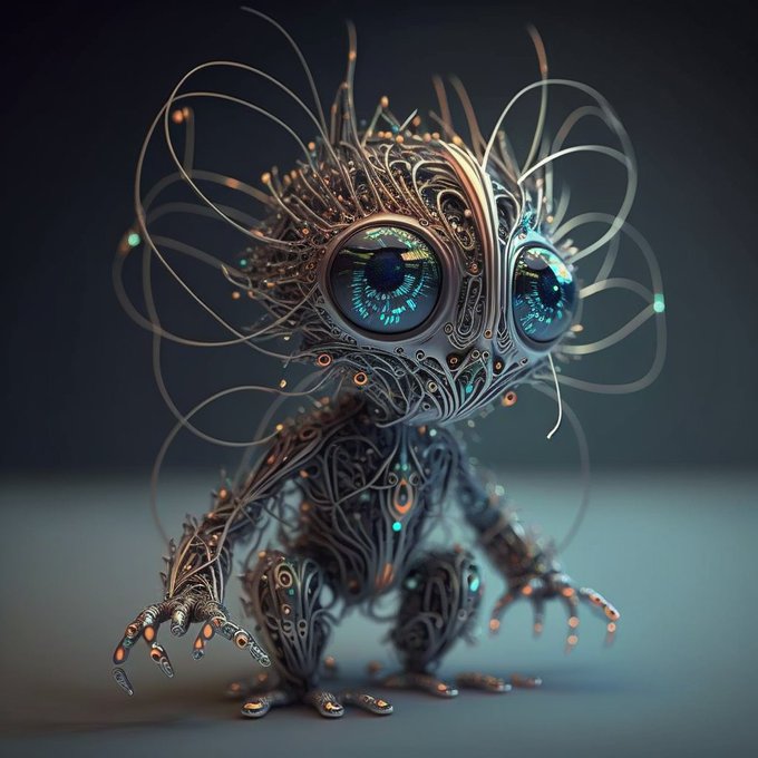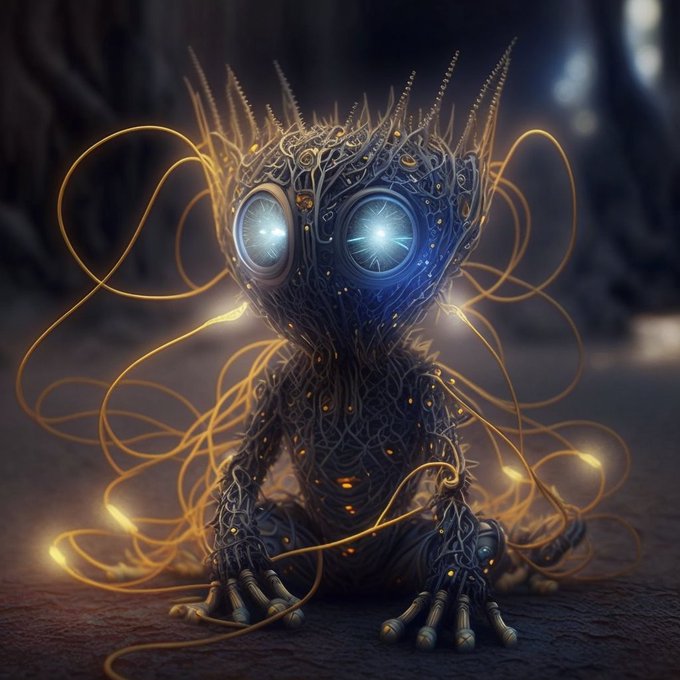 cute An alien creature with a body made of wires and circuits, glowing eyes that emit bright flashes of light, and intricate patterns etched into its metallic surface, representing the neural pathways of a self-aware artificial intelligence --q 2 --v 4 --s 750