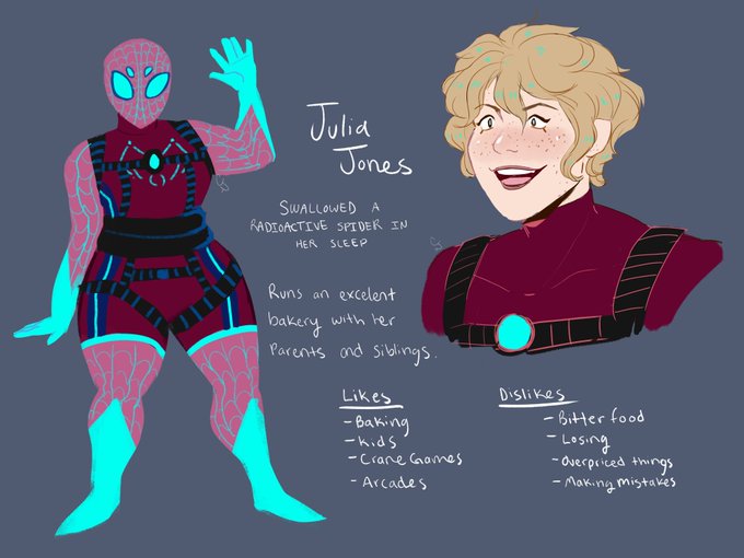 Decided to make a full spread of my #spidersona , Julia Jones! She's a baker that loves going to the arcade and winning prizes for the kids there, as she is essentially a human claw machine game. #IntoTheSpiderVerse