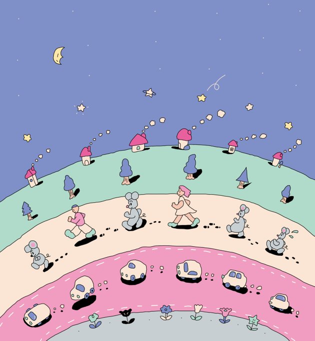 プレジデント Family 2021年冬号の扉絵を担当しました🐭 星と家と木と生き物と車と花が、偶然にも横と縦に規則的に並んだ瞬間です。こんなこともあるんですね。。(?)