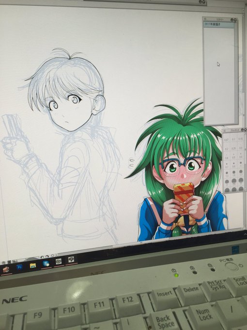 #みどりの日なので緑色の画像を貼る やはり驚きの如月さん率。サクカの如月さんは、肩を微妙に修正してTwitterには上げていない最終Ver。バレンタイン絵は、緑髪3人娘の内結局如月さんしか完成しなかったので日の目を見ず仕舞いに。そして最初にサクカで描いて没にした如月さん。