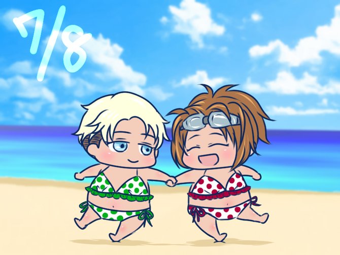 ナナバの日でナナハンの日とのことなので…こんがりナナハンちゃん 水着おそろいだよ! 背景はお借りしました #ナナバの日