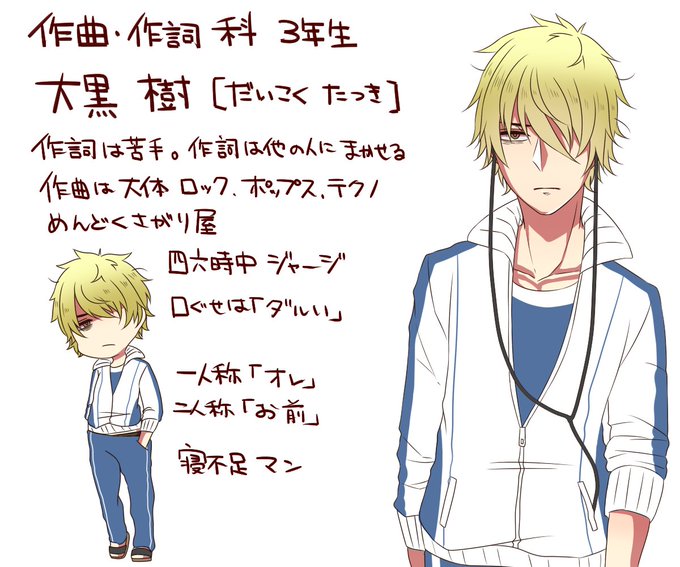 @idleka77kabeuti 作詞作曲科の大黒 樹(だいこく いつき)のキャラシできました!作詞できる人とコンビ組めたらなあ…って(ソワァ)他にもいっぱい絡んでいきたいです…♥