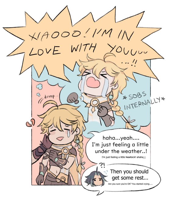 my piece for @xiaotherxchange! i drew a comic for pan (@a_ohisashi) the prompt was oblivious xiao and lovestruck aether ^^ #XiaoAether #XiaotherExchange2021