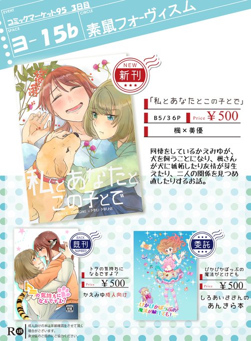 C95のお品書きだけできた。3日目、東ヨ-15b「素鼠フォーヴィスム」でかえみゆが犬を飼う話の本が出ます!サンプルは後ほど上げます!