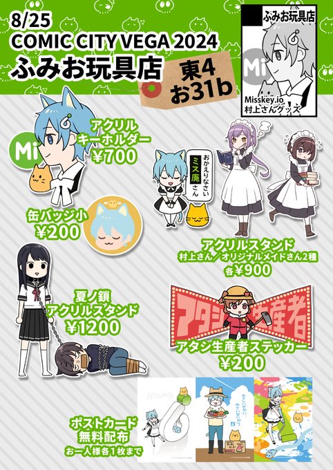 村上さん、夏ノ鎖、OCメイドさんグッズなどです アタシ生産者ステッカーはいっぱい刷ったのでぜひ