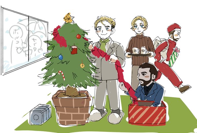 こっちは時間なくてボツになった絵 タゴちゃんのとこは消防車持たせたかったしツリーは逆行兵士とか色々飾りたかった…