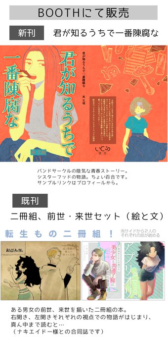 取り扱い:百合っぽい陰気な青春小説新刊と、コミティア既刊(ナキエイドー様との合同誌。絵と文。前世・来世転生もの男女。両サイドから読める凝った作りです!)