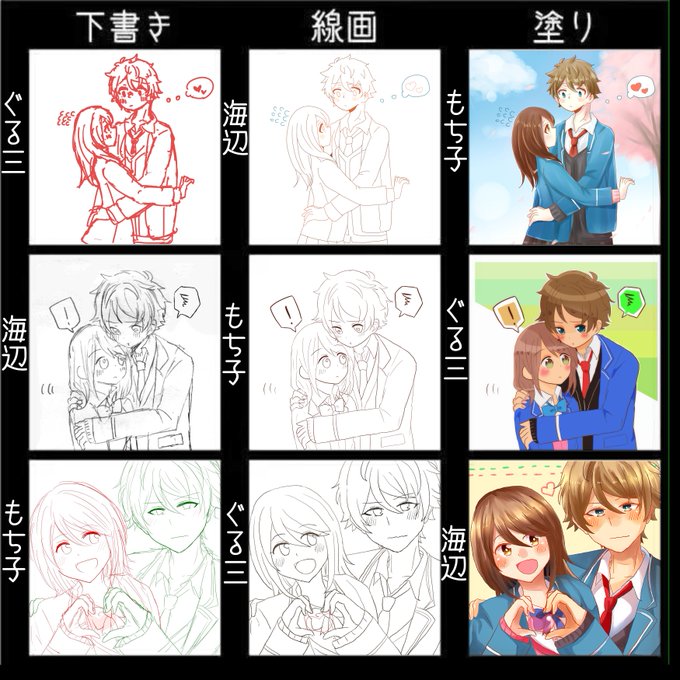 #3人で下書き線画塗りを交換して絵を完成させる ぐる三( @grm_anst )さんともち子( @chikin_mochiko )さんと私でやってみました。全部翠あんちゃんですよ!幸せ!(^o^)! 二人共仕事早くて尊敬です……。
