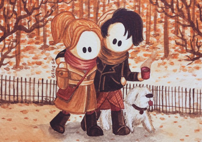 Watercolor of #Bughead & Hot Dog in a park in autumn, commissioned by @dollihaze (one of the amazing people I've met through this fandom) 🖤
