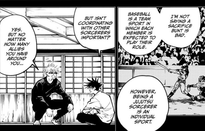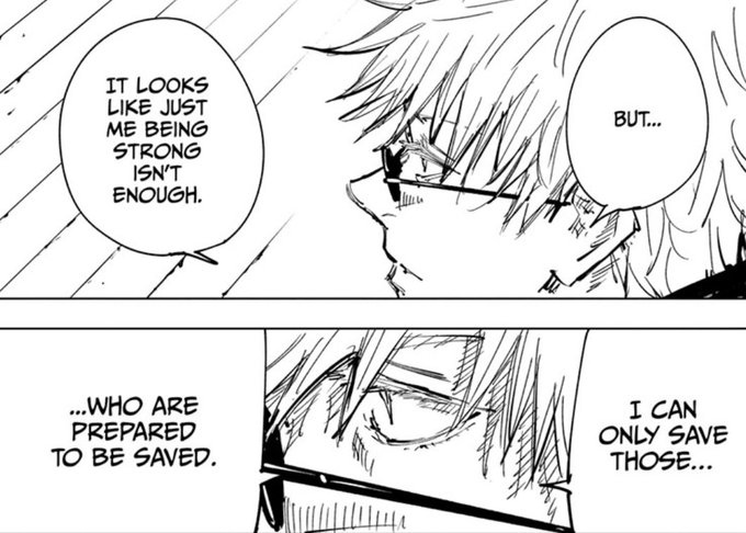 that’s when he realized: even though he’s strong, even though he beat toji and is continuing to evolve, no matter how powerful he is, he can’t help everyone, nor save the people (& their souls) who matter to him most. he realized every sorcerer dies alone.