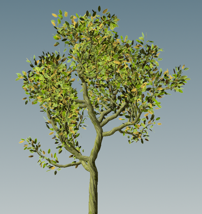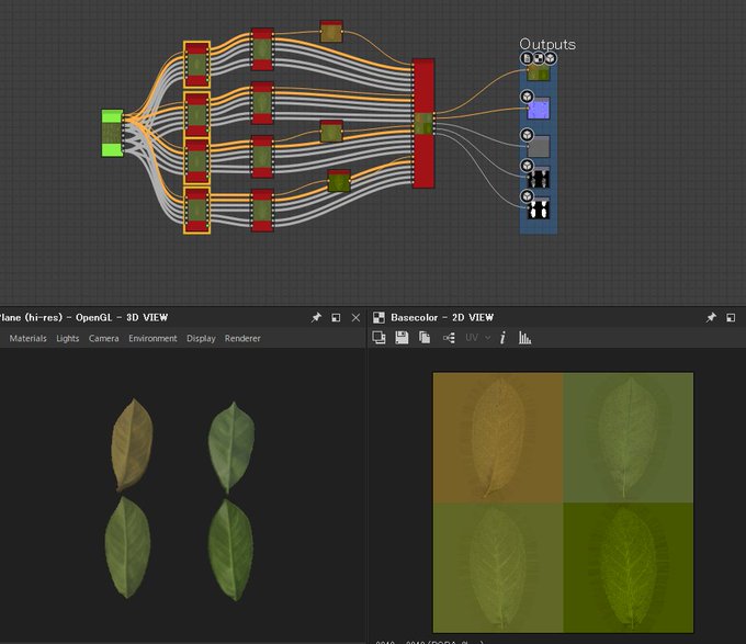 LabsSimpeTreeから別HDA化して、枝ぶり調整機能と葉っぱの調整機能をいくつか追加して、テクスチャはSubstanceSourceのアトラスを分解して調整して、とりあえず1種出来た。これでまたUE4に出して自動植生など検証。 #Houdini #SubstanceDesigner