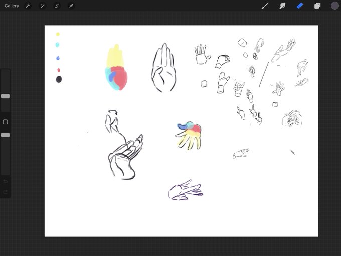 手の練習〜。1枚目さいとうなおき先生の動画見ながら、パルミー4色分け。2枚目 ラフ(酷くて良い)とって水色、緑、黄の順に塗って線描く。(うまくできなかったら写真撮る)この描き方が自分は描きやすいかも。hide chも見ながらするとわかりやすい。コベニ可愛い。ヘアピン塗り忘れた