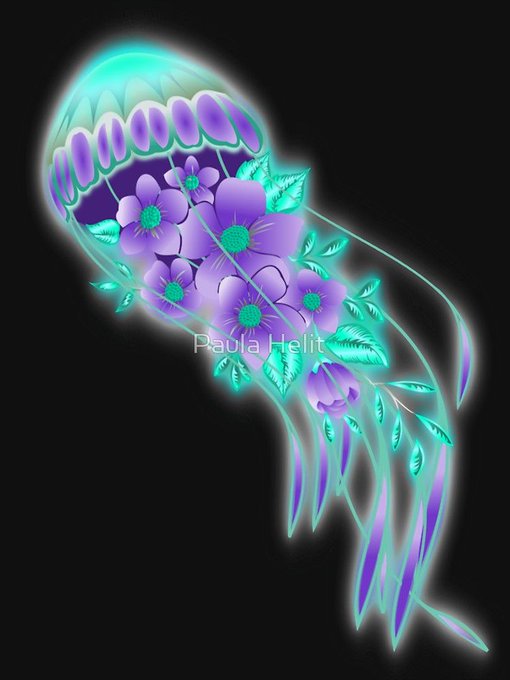 Glowing green and purple jelly fish with flowers.