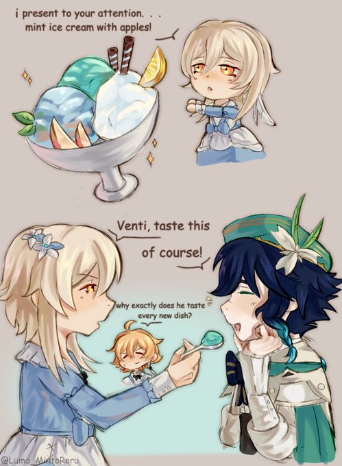 Так вот, небольшой комикс к AU @Kineli_Genshin , если бы сиблинги придумывали что-то новенькое, то Венти всегда был бы первым дегустатором :D