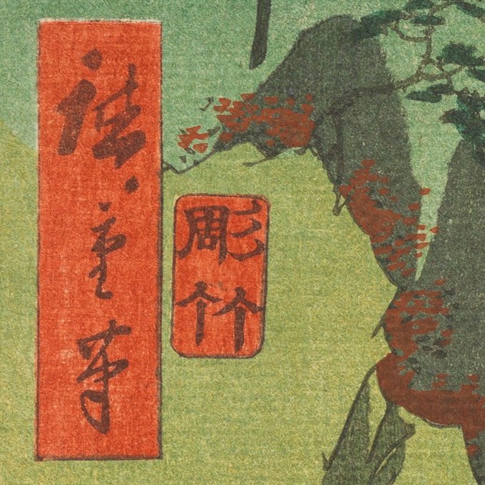 やっぱり緑色を見ていると心が安らぎますね。アダチ版の浮世絵でも、緑色探してみました。浮世絵の絵具は、基本的に赤・青・黄の三原色を #摺師 が混色してつくるので、さまざまな緑色があります。#おうちで浮世絵 ↓紹介した作品の情報はスレッドに続きます。