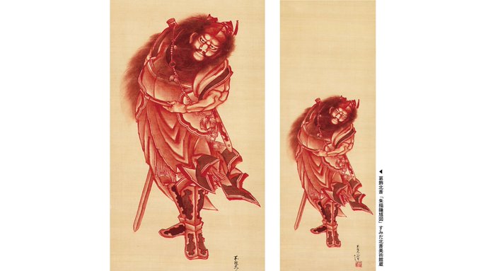 鍾馗図は中国で疫病神を祓って魔を除くと信じられ、日本でもよく描かれた画題。北斎による本作は朱色を基調に描かれています。微笑みをたたえたお顔にご注目ください😊