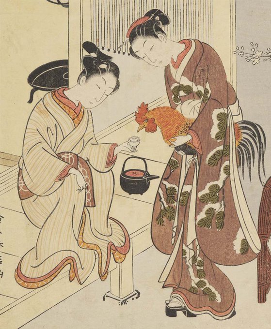 若いカップルが鶏に何かを飲ませようとしていますが、実はお酒。日が昇るのが早くなってきた初夏、恋人たちは夜の逢瀬の時間を少しでも長くしようと、鶏を酔わせて、朝に鳴かせないようにしています。鶏の目つきは、その企みに気が付いているのか…。鈴木春信の作品です。 #おうちで浮世絵