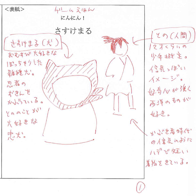 『にんにん!さすけまる』、絶好調発売中です。左は、編集と文担当の #たきのみわこ さんによる、ラフ&指示書。右は、それを元に絵担当の #ねこまき さんが仕上げてくださった、殿&さすけまるです☺️