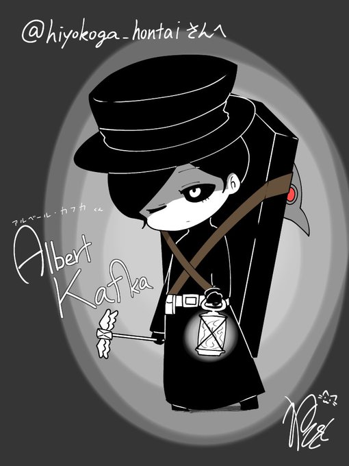 再投稿。「あなたのうちの子描くよキャンペーン」2人目、ひよこっぽい(@hiyokoga_hontai)さんちのアルベール・カフカくんと紫電断くんです!