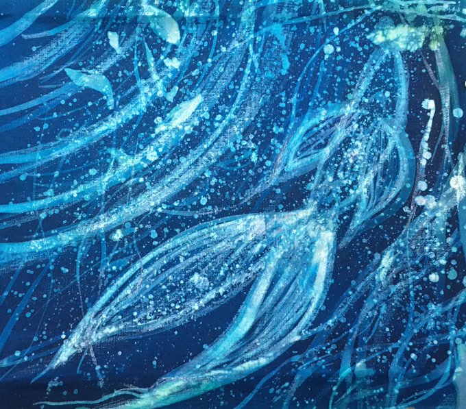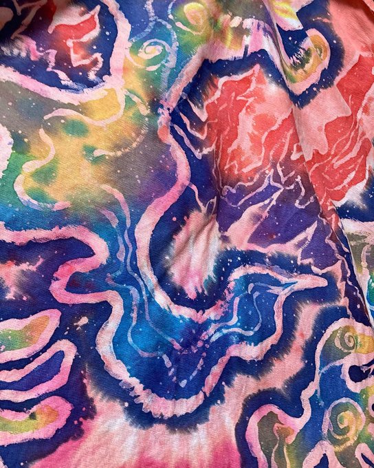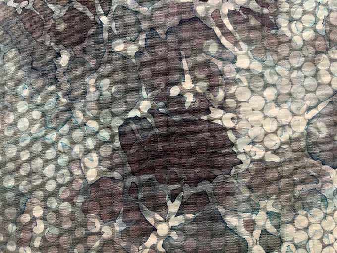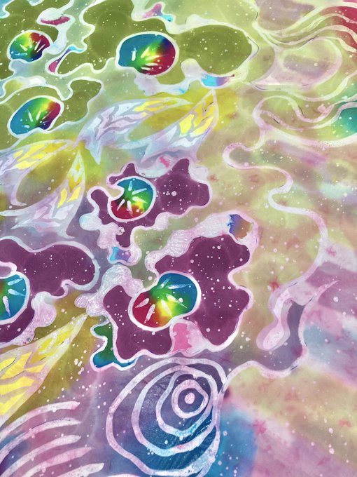 ろうけつ染めで絵柄を何層にも重ねて制作することで、染色ならではの透明感のある発色と柔らかで深みのある表情が作り上げられています。