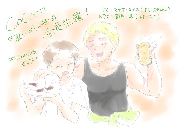 シナリオ終了です!いやあ同じ技能で3回もファンブルするのは右手がおかしすぎるwwwあと饅頭さんのキャラが固すぎてやばい。めちゃくちゃ楽しかった。同卓ありがとうございました!