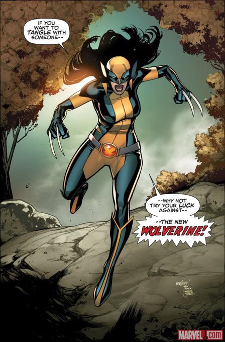 3.X-23(MARVEL) 本名ローラ・キニー。ウルヴァリンのクローンでローガンとは真に親子の信頼関係で結ばれている。数年前にローガンが死亡してから紆余曲折を経てウルヴァリンの名を襲名。様々なヒーローと繋がりを築きつつ成長を続けている。妹もできた