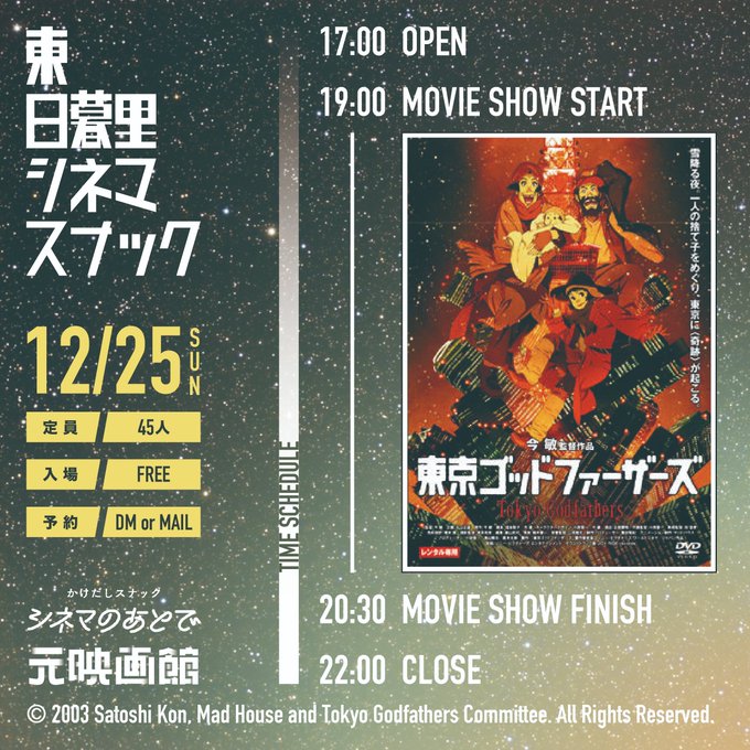「元映画館/スナックシネマのあとで」年内最終営業日は12/25(日)です。聖なる夜の営業は{東日暮里シネマスナック}と題して、クリスマス映画の特別無料上映を行います。