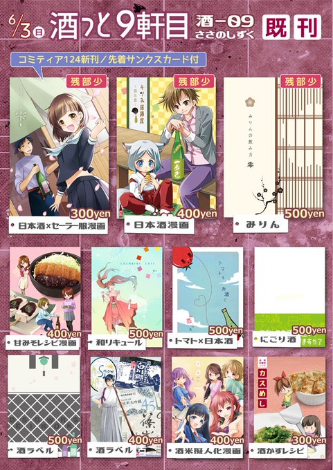 新刊は日本酒イベレポの薄いコピー本。既刊含め各頒布数は少めです。コミティア124新刊には先着でサンクスカード付。振舞い酒はKURAND CULB会員限定のPB酒丹波の雫とラベル担当させて頂いた酒泉洞堀一様PB白老7の予定です。酒器等ご持参頂けると助かります。