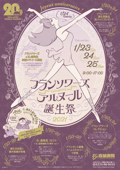 1/24と1/25はそれぞれサイボーグ003ことフランソワーズ・アルヌールと石ノ森章太郎先生(&ギルモア博士)の誕生日です🎂萬画館では1/23より誕生日を記念したイベントを開催します✨オススメはグッズショップでもらえる限定缶バッジ💕素敵なデザインなのでぜひチェックしてね♪