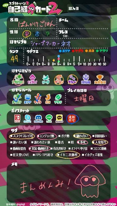 #スプラトゥーン2自己紹介カード #スプラトゥーン2フレンド募集中 #スプラトゥーン2やってる人と繋がりたい