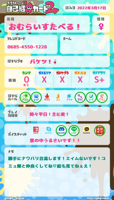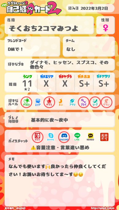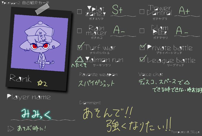 #スプラトゥーン2自己紹介カード #スプラトゥーン2している人と繋がりたい #スプラトゥーン2フレンド募集