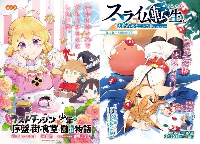 3月号の巻中カラーは、「恋愛グリモワール~最強童貞の勇者様が結婚しないと世界は滅亡するそうです~」「ラスダン村人スピンオフ」「スライム転生。大賢者が養女エルフに抱きしめられてます」「不徳のギルド」「社畜さんは幼女幽霊に癒されたい。」の5作品です☆ ぜひチェックを♪ #少年ガンガン