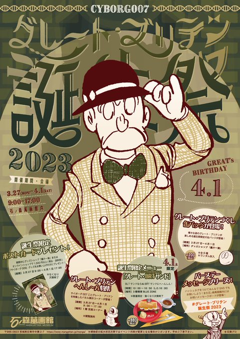 \ #グレート・ブリテン誕生祭2023 予告/ 4/1(土)はサイボーグ007ことグレート・ブリテンの誕生日❗️石ノ森萬画館では記念イベントを開催します🎉誕生祭限定の缶バッジの販売やポストカードのプレゼント、メニューも登場🎂 みんなでお祝いしましょう✨(3/27~4/1開催) https://t.co/8IPmScwD47 https://t.co/1oFuIk57Mt
