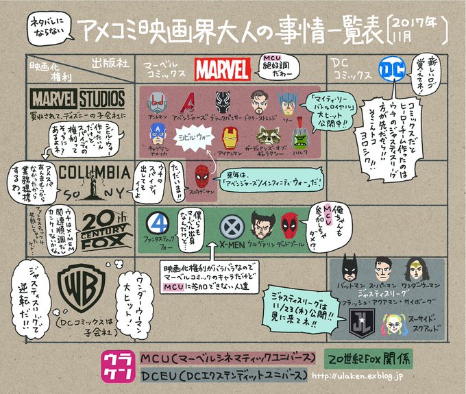 面白かったけど、メタ的要素が前作に増して多いので、FOXとディズニーの関係とかアメコミ映画界の大人の事情が、頭に入ってるどうかで、笑える範囲と深度がかなり変わってくると思う。だいぶ前に作った表だけど、参考までにどうぞ。