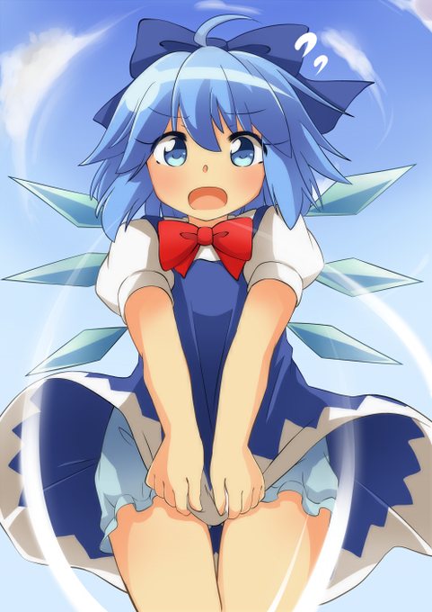 お題「風で捲れ上がるスカートを恥ずかしそうに手で押さえつつドロチラするチルノ」