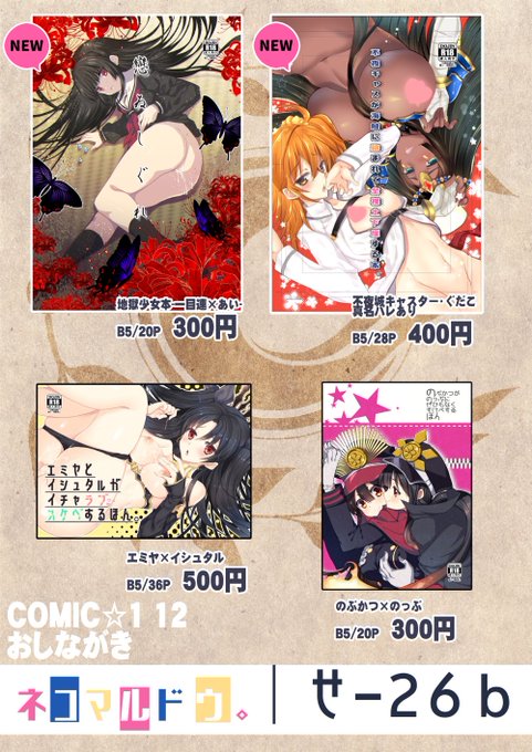 10/15 COMIC1☆12(東京ビッグサイト)せ26b にスペースをいただきました。新刊はFGO本ですので、来られる方はよろしくお願いします。地獄少女本も余ったらもっていきます! ネコマルドウ。
