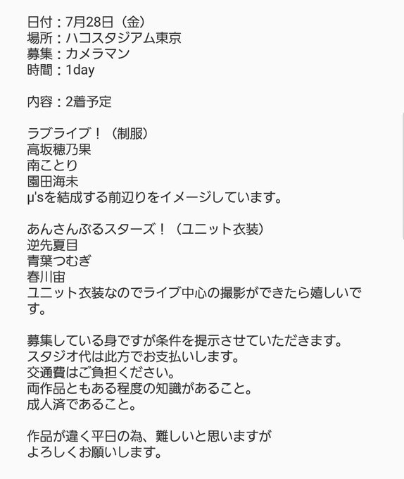 7月28日㈮に関東ハコスタジアム東京にてラ!とあんスタ!の併せを行うにあたりカメラマンさんを募集しております。詳細は添付画像をご確認ください。ご都合のつく方、興味のある方や質問などございましたらリプかDMお願い致します。