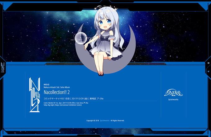ファーストビューのイラストの力強さはもちろん、それを引き立てる緻密なブラウザ枠のデザインや区切り線、背景の流星の演出など、絶妙なバランスで上品に仕上がってると思います。フッターのSDキャラもかわいい。